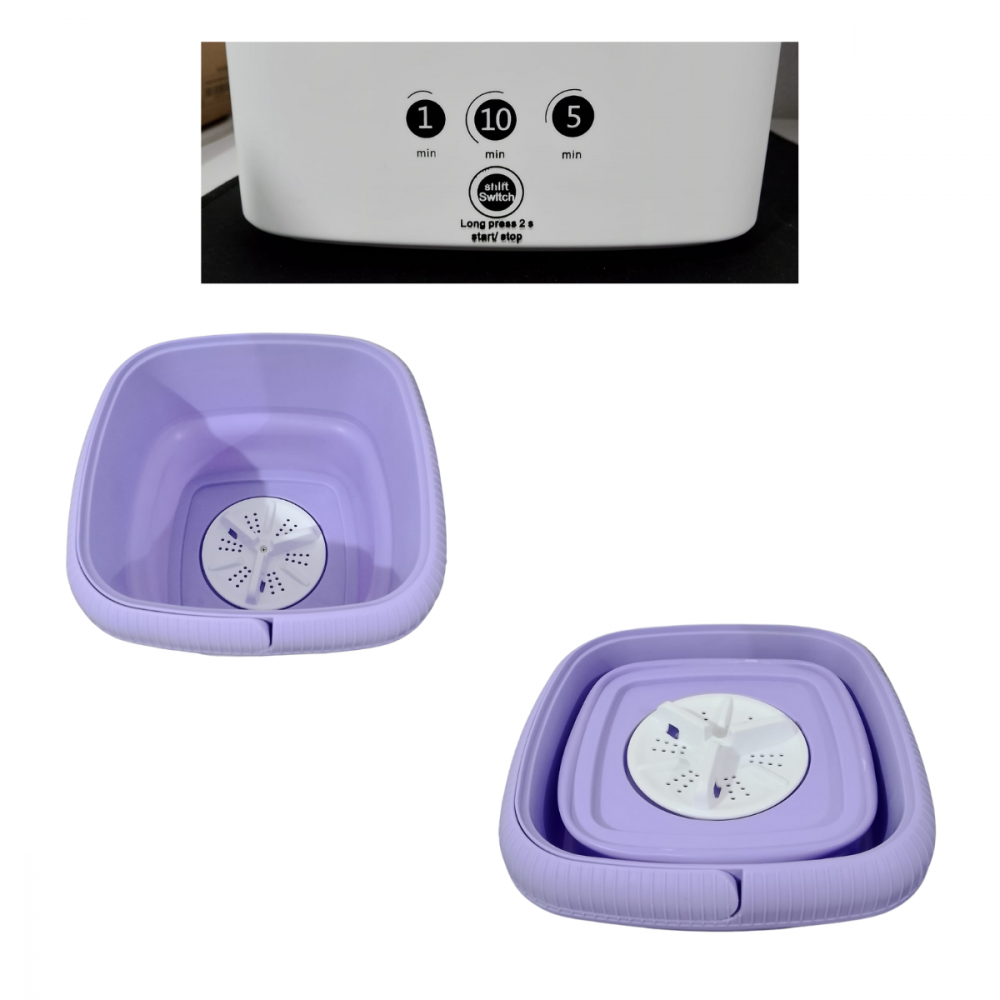 A mini máquina de lavar roupa dobrável é um produto compacto e portátil, ideal para lavagem de roupas em espaços reduzidos. Possui um design que permite ser facilmente dobrada e guardada quando não está em uso, sendo perfeita para apartamentos pequenos, acampamentos e viagens.