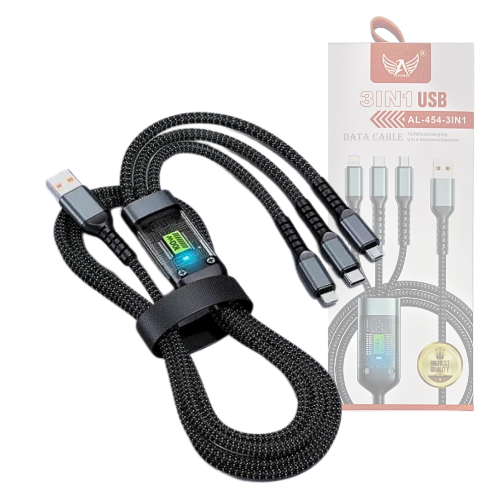 O Cabo Carregador 3 in 1 AL-454-3IN1 é um cabo de carregamento multifuncional projetado para carregar diversos tipos de dispositivos utilizando diferentes conectores, com a capacidade de suportar alta potência de carregamento.
